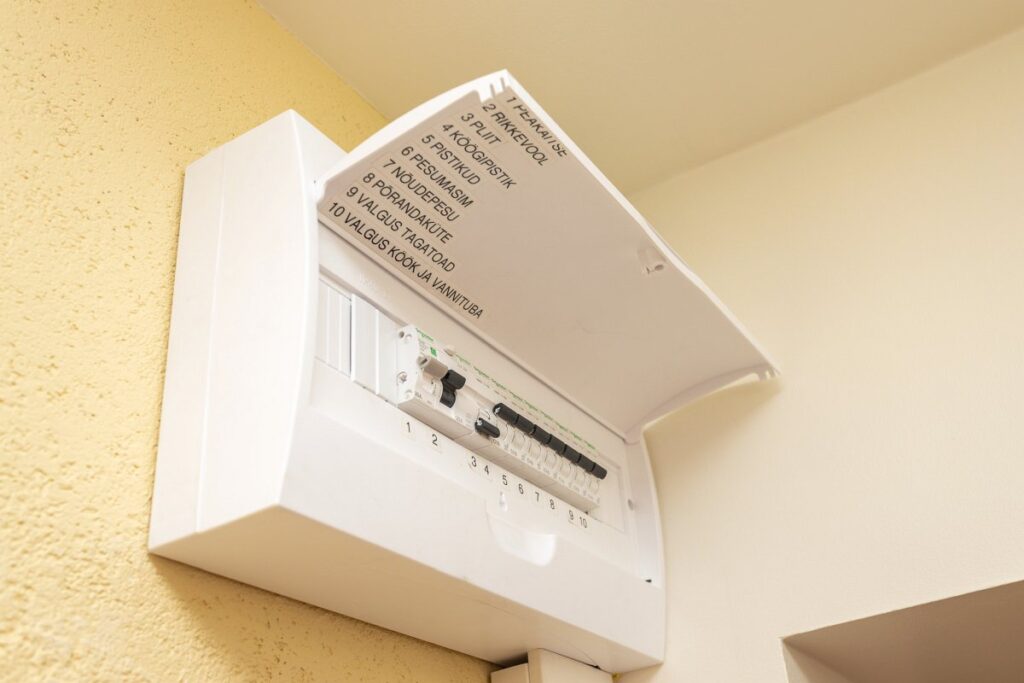 Vahetasime ära ka elektrisüsteemi ja kuna põrand tuli niikuinii uuendada, siis sai osa elektrikaabeldusest samal ajal viia põranda alla, et vähendada seintesse pikkade lisakanalite süvendamist. Eesti Energia lubas elektriarvesti plommid maha võtta ja peakaabli ümber tõsta. Korterisse tuli sisse juba uus juhe, kuna majal olid peakaablid vahetud. Elektripistikud ja lülitid valisime ABB Basic 55 seeriast, mis on neutraalse disainiga ja vastupidav.